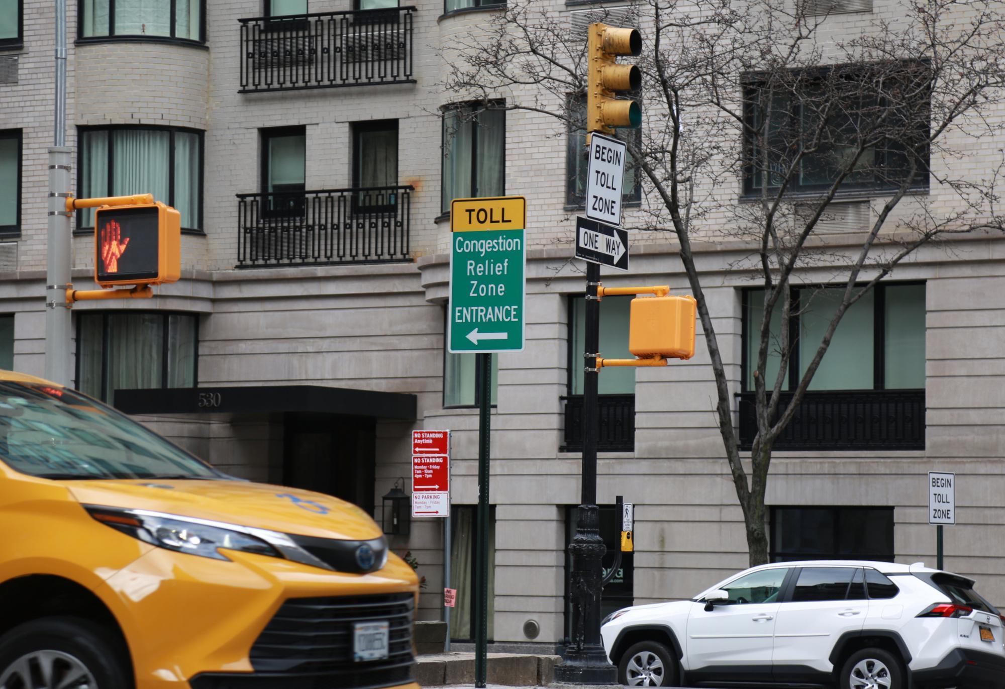 1月5日,在美国纽约曼哈顿,出租车通过一个设有征收拥堵费标志牌的路口。新华社记者刘亚南摄预计征收拥堵费每年可以带来10亿美元收入,从而为该市包括老旧地铁和市郊铁路改造的高达150亿美元的交通开支计划提供资金。