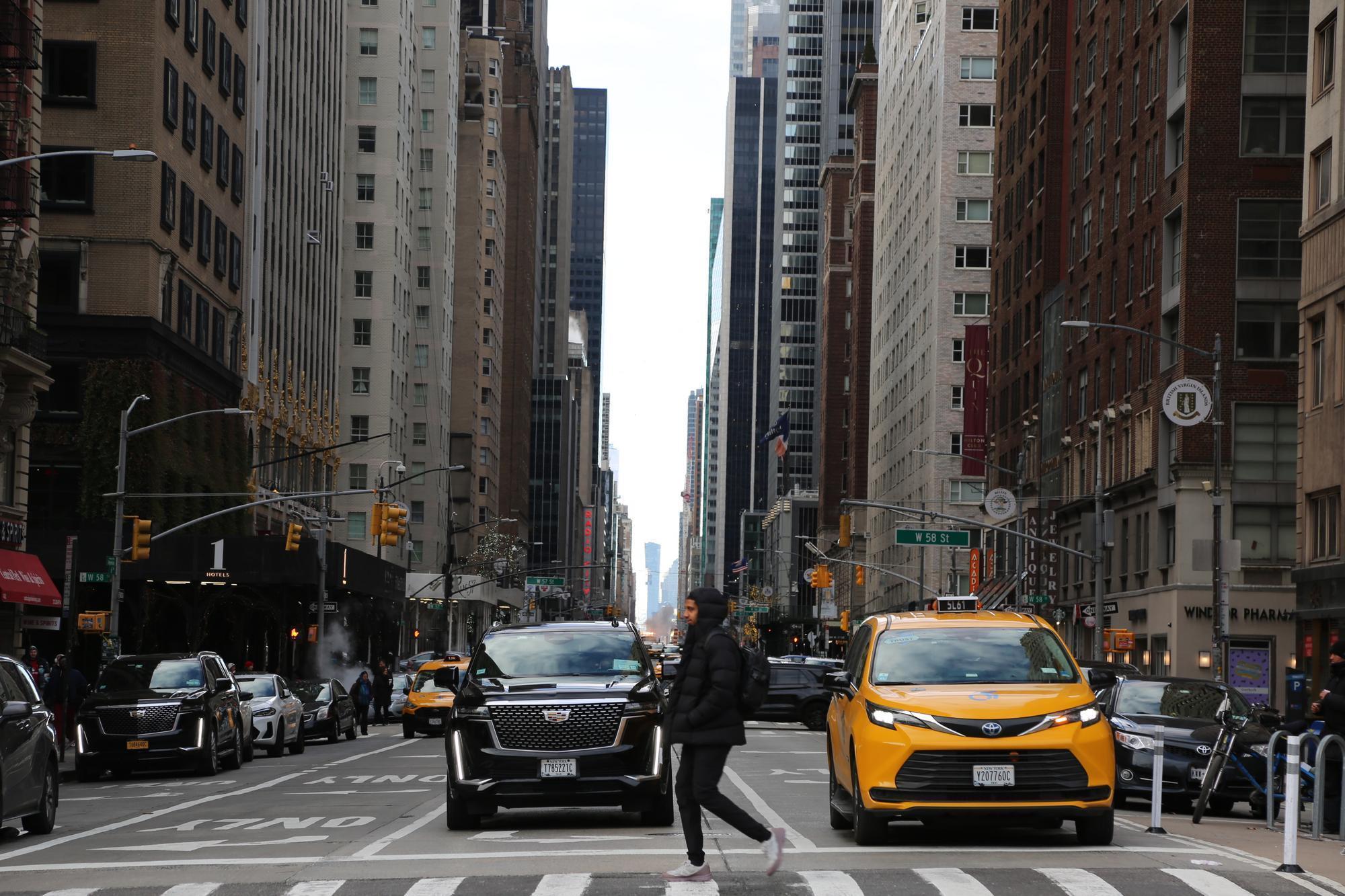 1月5日,在美国纽约曼哈顿,行人通过拥堵减缓区内的一个人行横道。新华社记者刘亚南摄交通局在社交媒体X上说,公交车行驶速度比以前更快,特别是早高峰时段,交通流量下降还令其他驾车者节省了时间。
